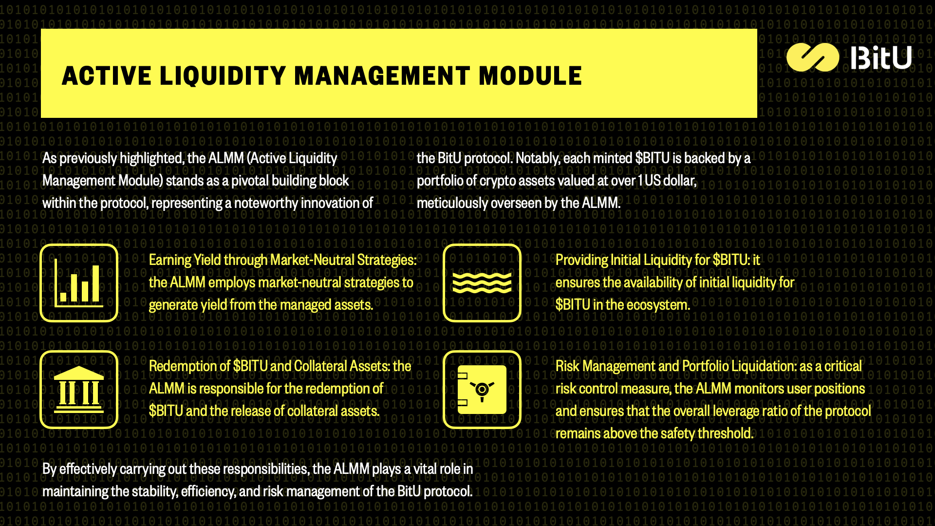 * Redemption of $BITU and collateral assets: ALMM handles the redemption of $BITU tokens and the release of collateral assets.