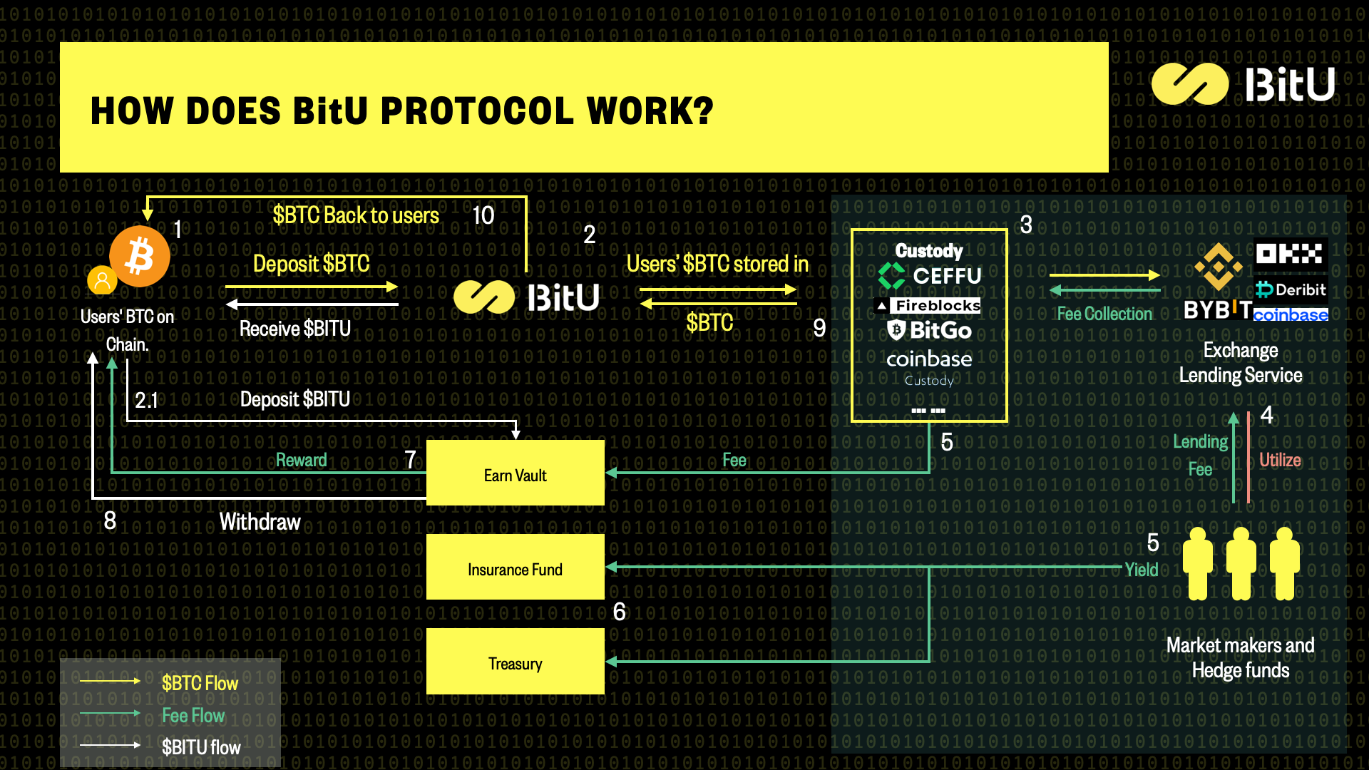 BitU Protocol employs the ALMM to optimize yield and liquidity, while maintaining the highest standards of safety and transparency through partnerships with leading auditors and custody providers. The ALMM leverages off-chain liquidity and transaction efficiency to generate higher yield for on-chain funds.&#x20;