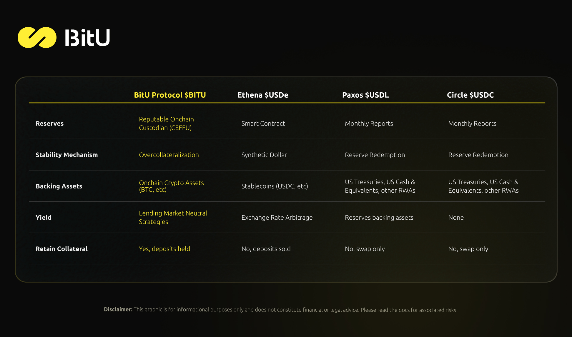 By minting the $BITU stablecoin, users' deposited collateral assets will be securely held by our licensed custodians and mirrored into exchanges. Only the user can access their deposited assets, as the mirrored collateral assets do not use deposits to trade.